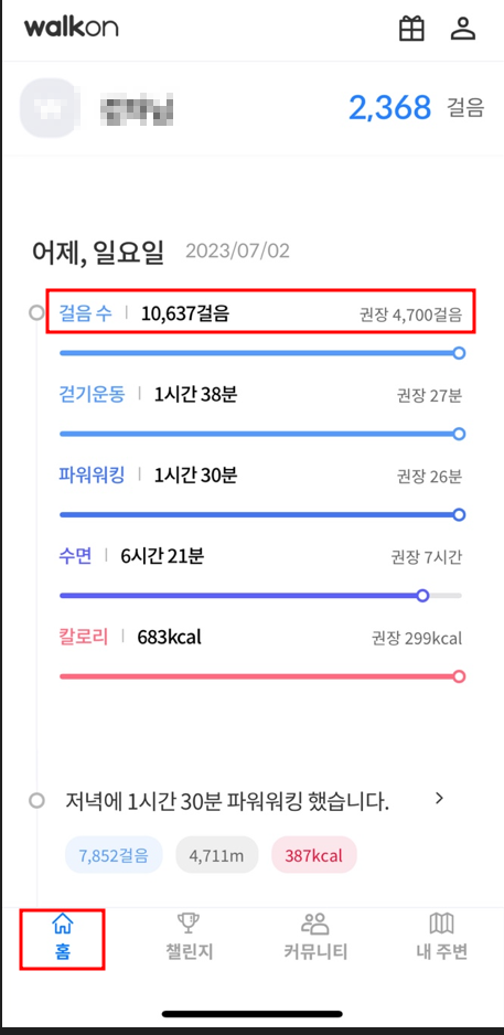 그 밖에 워크온에서는 걸음수, 걷기 운동 시간, 파워워킹, 수면 시간, 칼로리 등을 알려주고 있습니다.