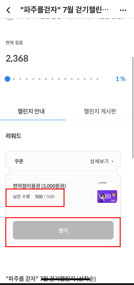 걷기 챌린지를 다 하시면 3,000원권 편의점 이용권을 받을 수 있는데 500 명에게 선착순으로 나눠줍니다. 20만보를 모두 달성했다고 모두에게 주는 것은 아니기 때문에 꼭 숙지해 주세요!
