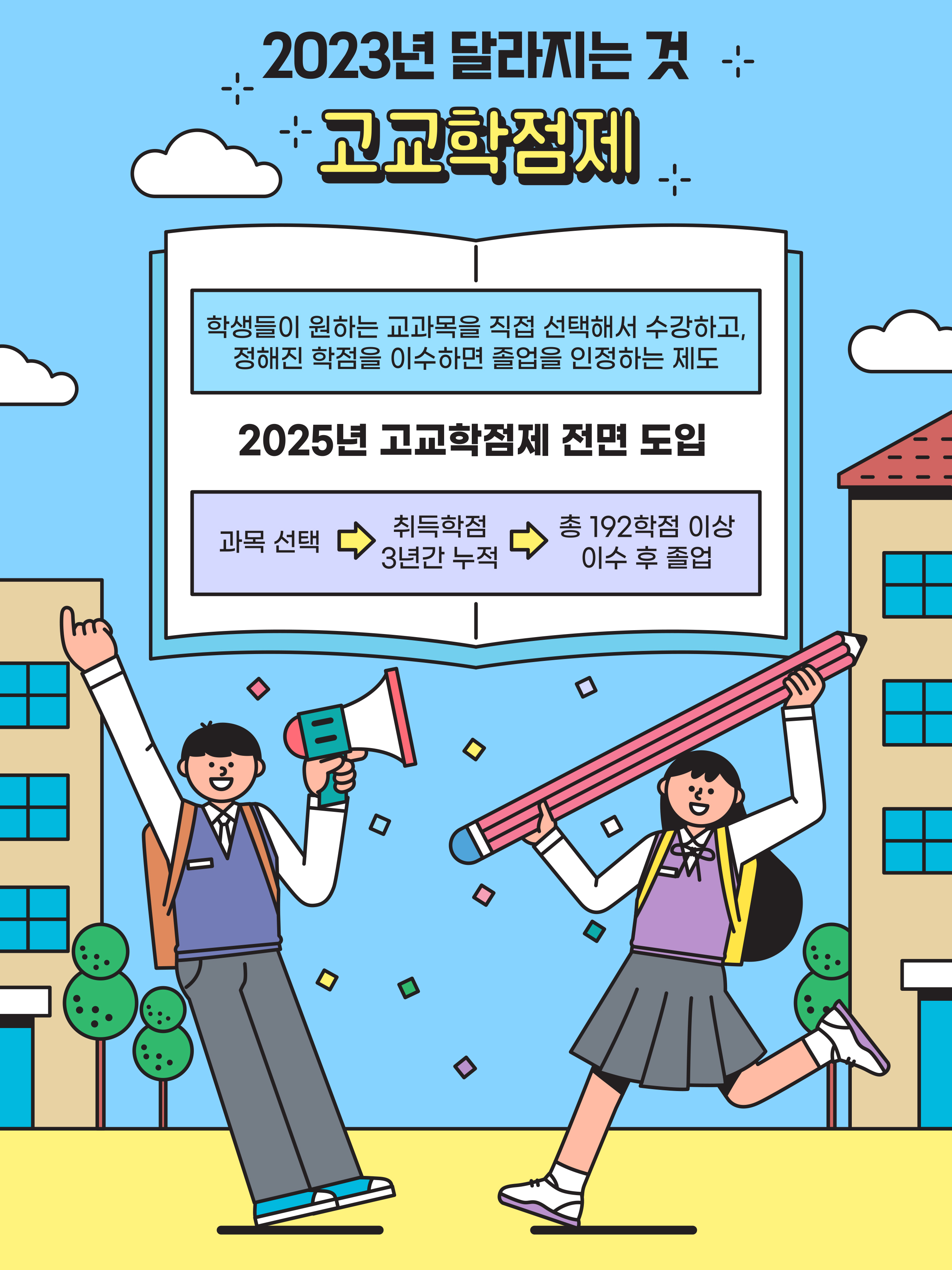 고교학점제의 핵심은 학생이 직접 과목을 선택하고, 이수 기준에 도달하는 과목에 대해 학점을 취득하고 이 학점이 누적돼서 192학점 이상이 되면 졸업하게 됩니다. 대학교와 유사한 방식입니다. 사교육을 줄이고 공교육을 강화하기 위해 2025년부터 고교학점제를 도입하게 됩니다.