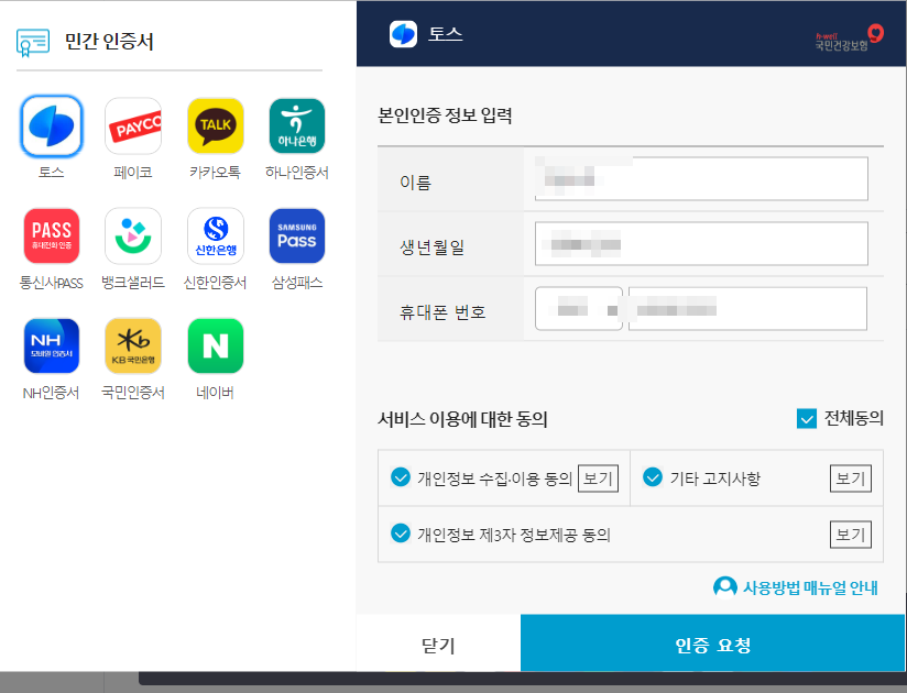 토스로 인증을 했는데, 모바일에서 토스 앱이 깔려있어야 하며 토스에서 인증하기 위해 비밀번호로 본인 인증 확인하시고 완료를 누르시면 됩니다.
