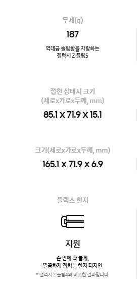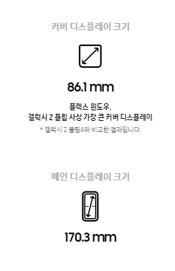 86.1mm의 커버 디스플레이며 Z플립 4보다 더 커졌습니다. 무게는 Z플립 4와 동일하나 접힌 상태의 세로 길이가 줄어들었으며 손안에 착 붙게 깔끔하게 접히도록 업그레이드 됐다.