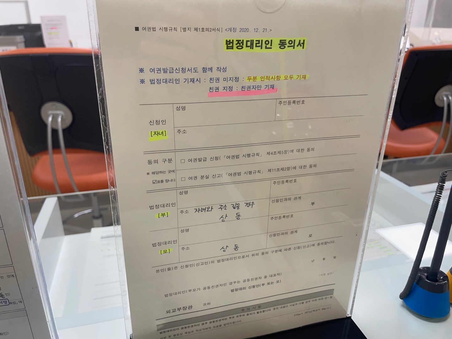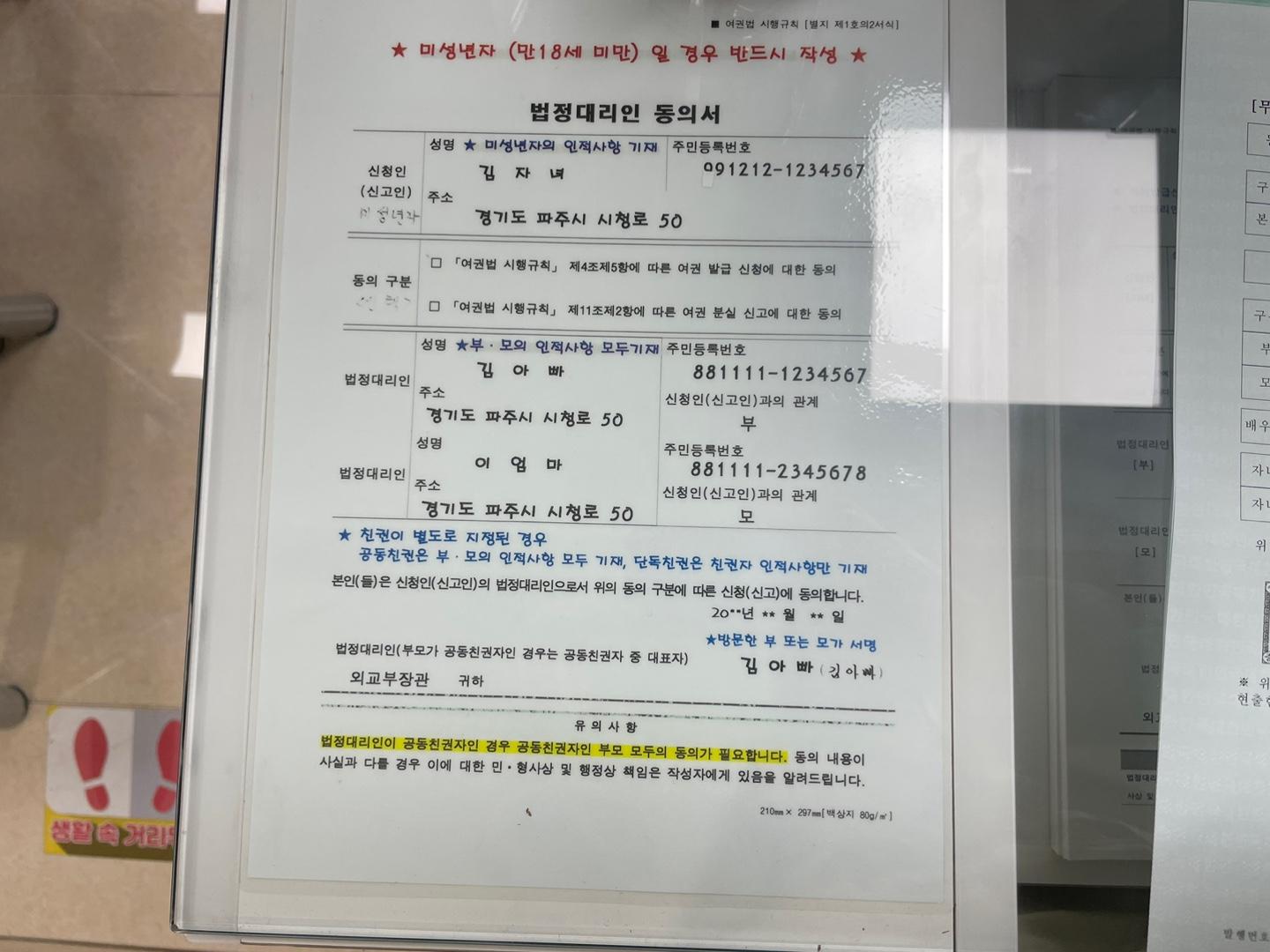 저는 자녀들 여권신청을 해야했기에 법정대리인 동의서를 작성했습니다. 2명이다 보니 자녀마다 각각 서류 작성했습니다.