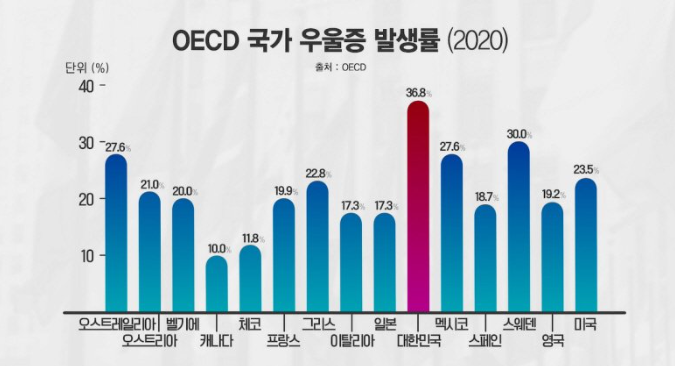OECD 국가 중 우울증 발생률 1위는 대한민국이다. 한국인의 정신건강이 매우 위태롭다. 올해 들어 발생한 끔찍한 사건 사고가 이것을 반증한다.