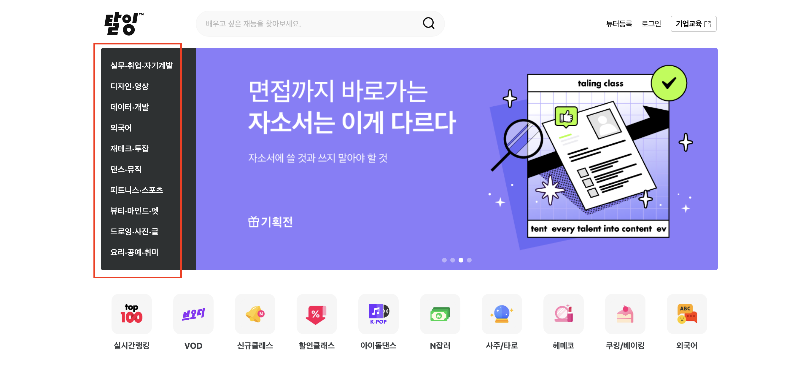 탈잉은 배움을 갈망하고 모든 재능이 콘텐츠가 되는 세상을 꿈꾼다라는 비전을 두고 있습니다. 비전이 상당히 멋집니다.