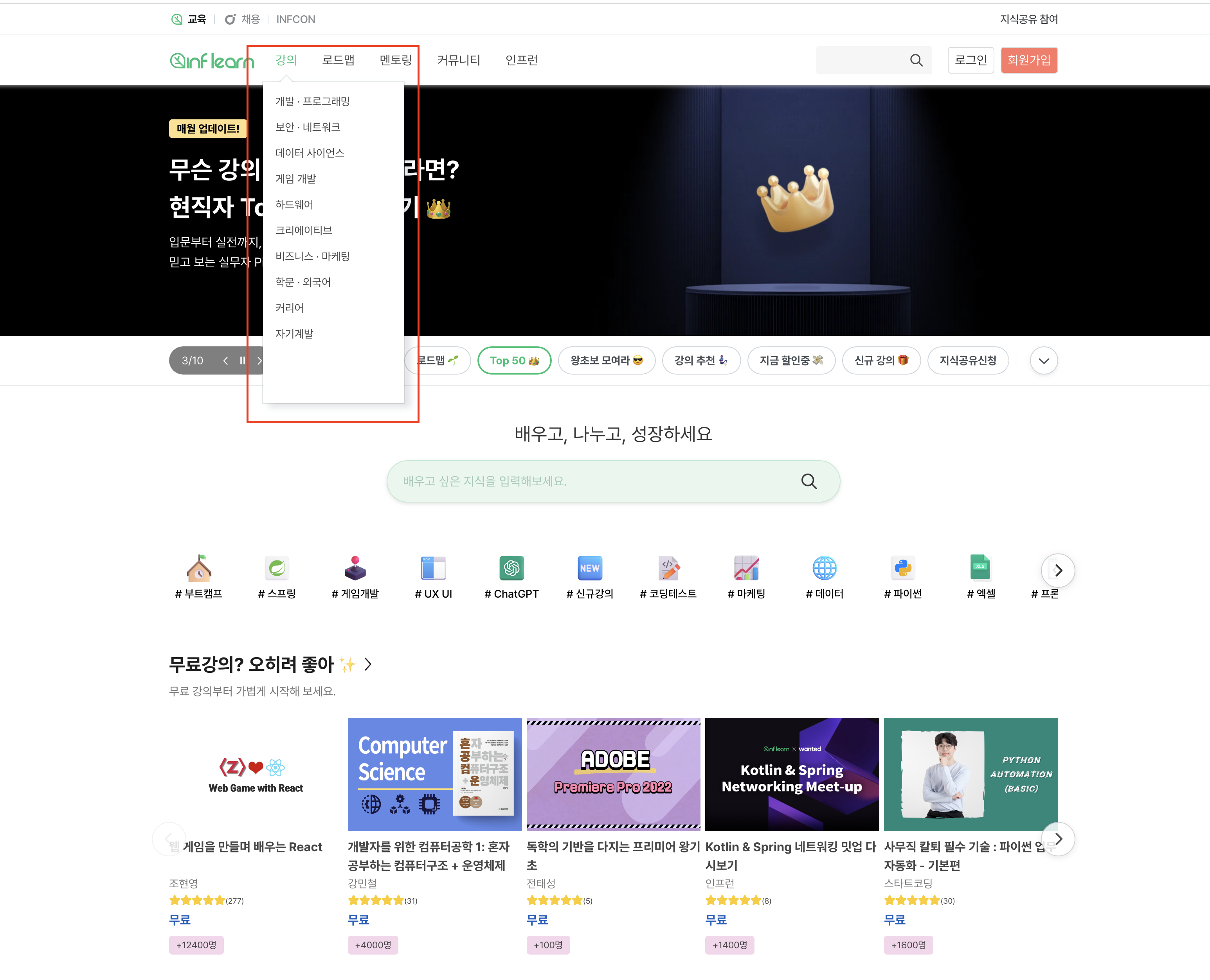 인프런은 개발, 프로그래밍, 데이터 분석 등을 전문적으로 다루는 강의 플랫폼입니다.