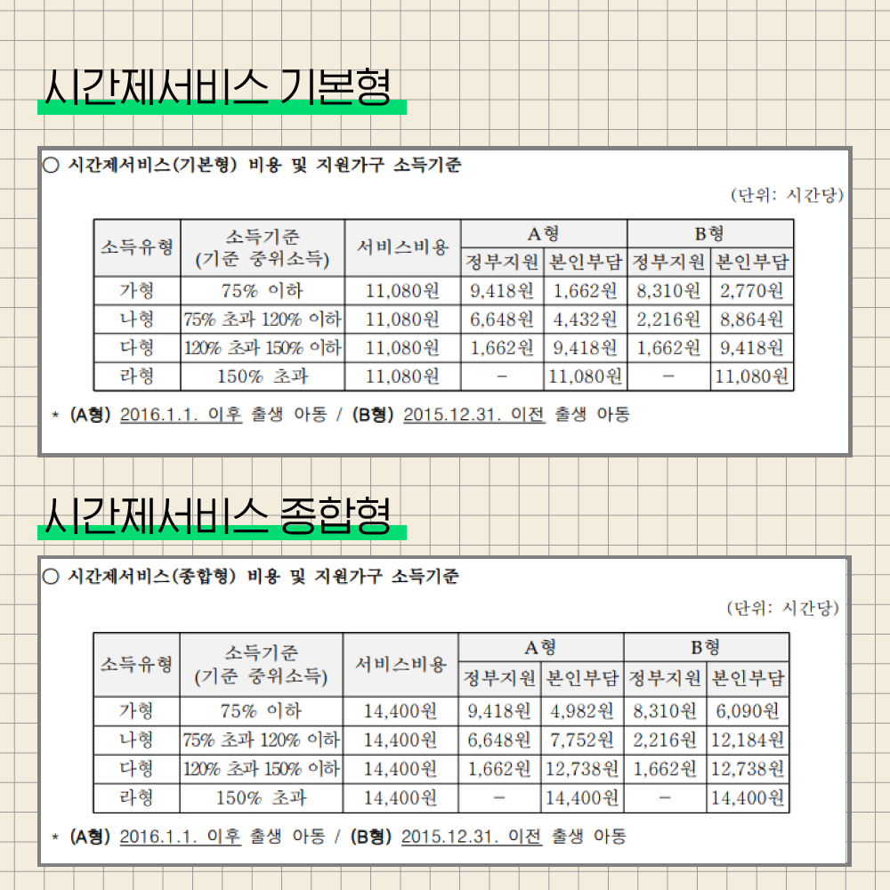 아이돌봄 서비스의 종류는 총 4가지이며 서비스별로 돌봄 지원대상의 연령이 상이합니다.