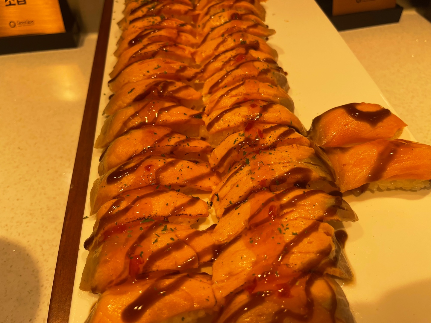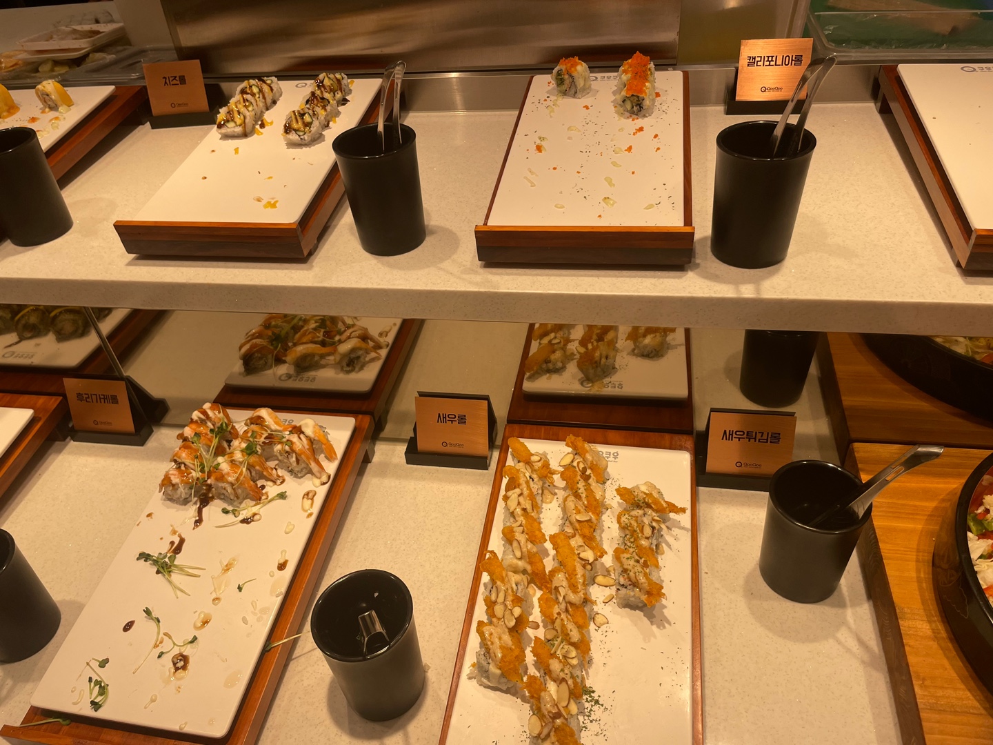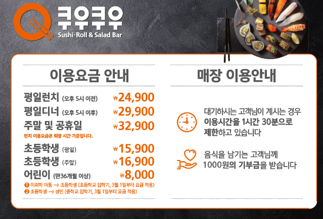 120여 가지 초밥, 롤, 군함과 각종 핫음식들, 샐러드, BBQ 코너 등이 있어 많은 음식을 맛볼 수 있습니다.