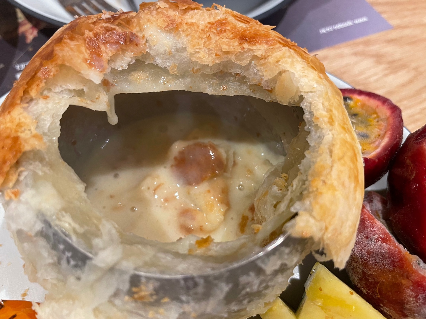 수저로 빵을 깨듯이 깨면 빵이 컵에 담겨있는 스프로 떨어져요. 스프랑 섞어서 드시는 거고, 좀 식으면 손으로 뜯어 드셔도 됩니다.