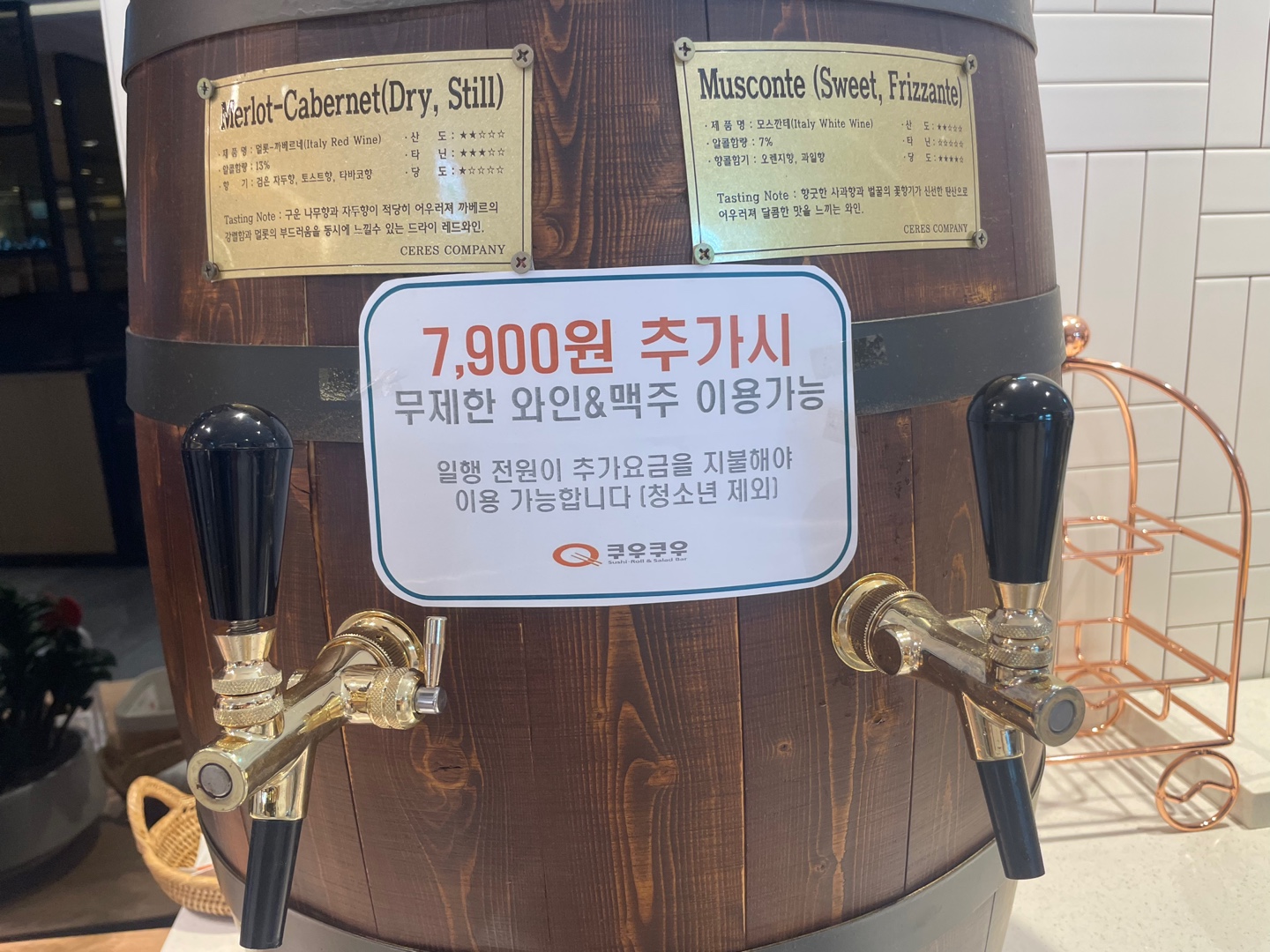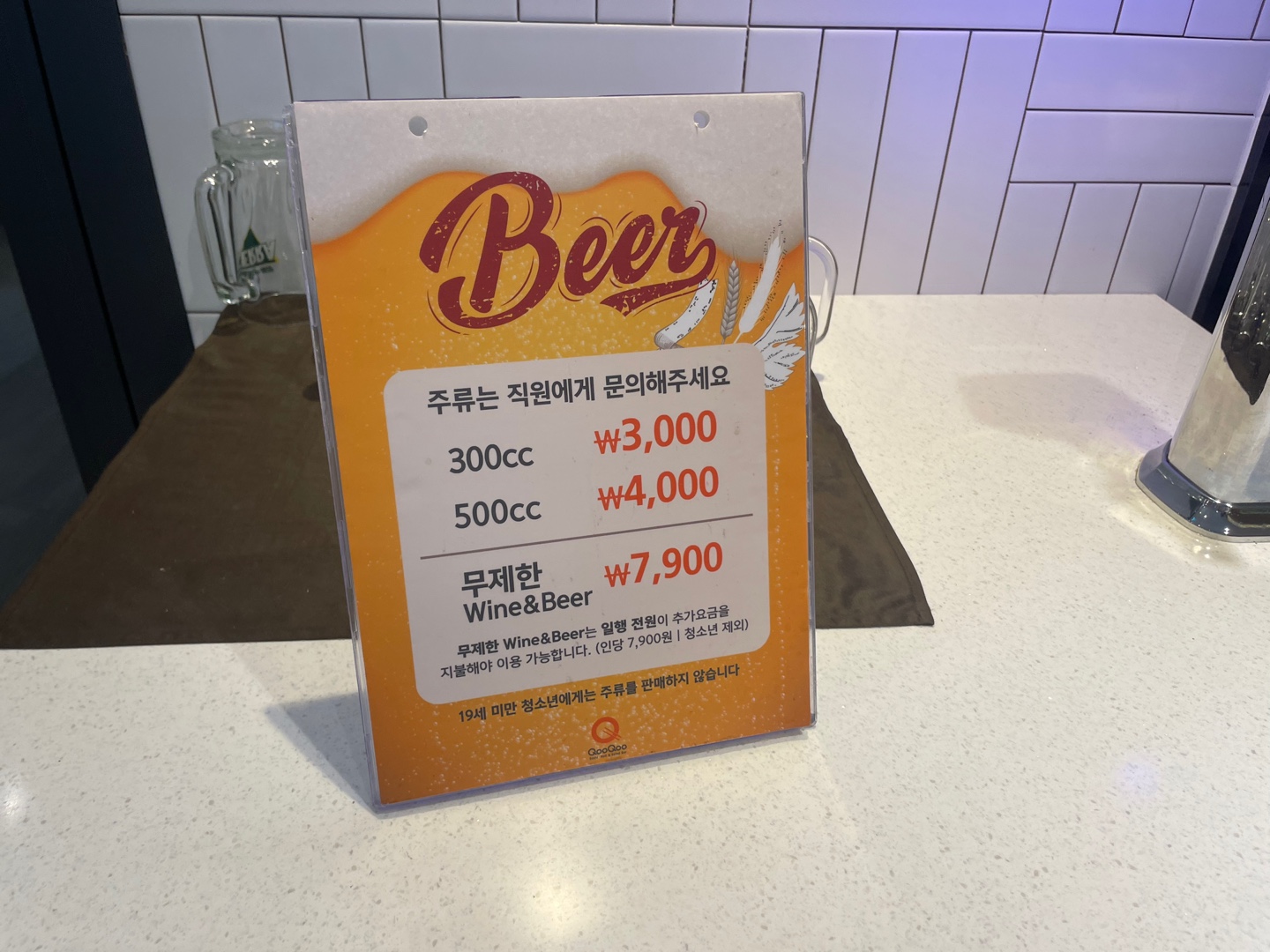 300cc는 3,000원 500cc는 4,000원이고 7,900원을 내시면 맥주와 와인을 무제한으로 드실 수 있습니다.