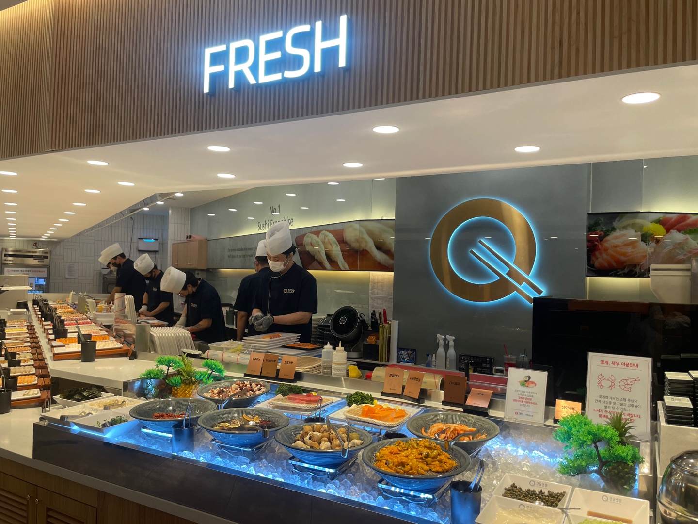 120여 가지 초밥, 롤, 군함과 각종 핫음식들, 샐러드, BBQ 코너 등이 있어 많은 음식을 맛볼 수 있습니다.