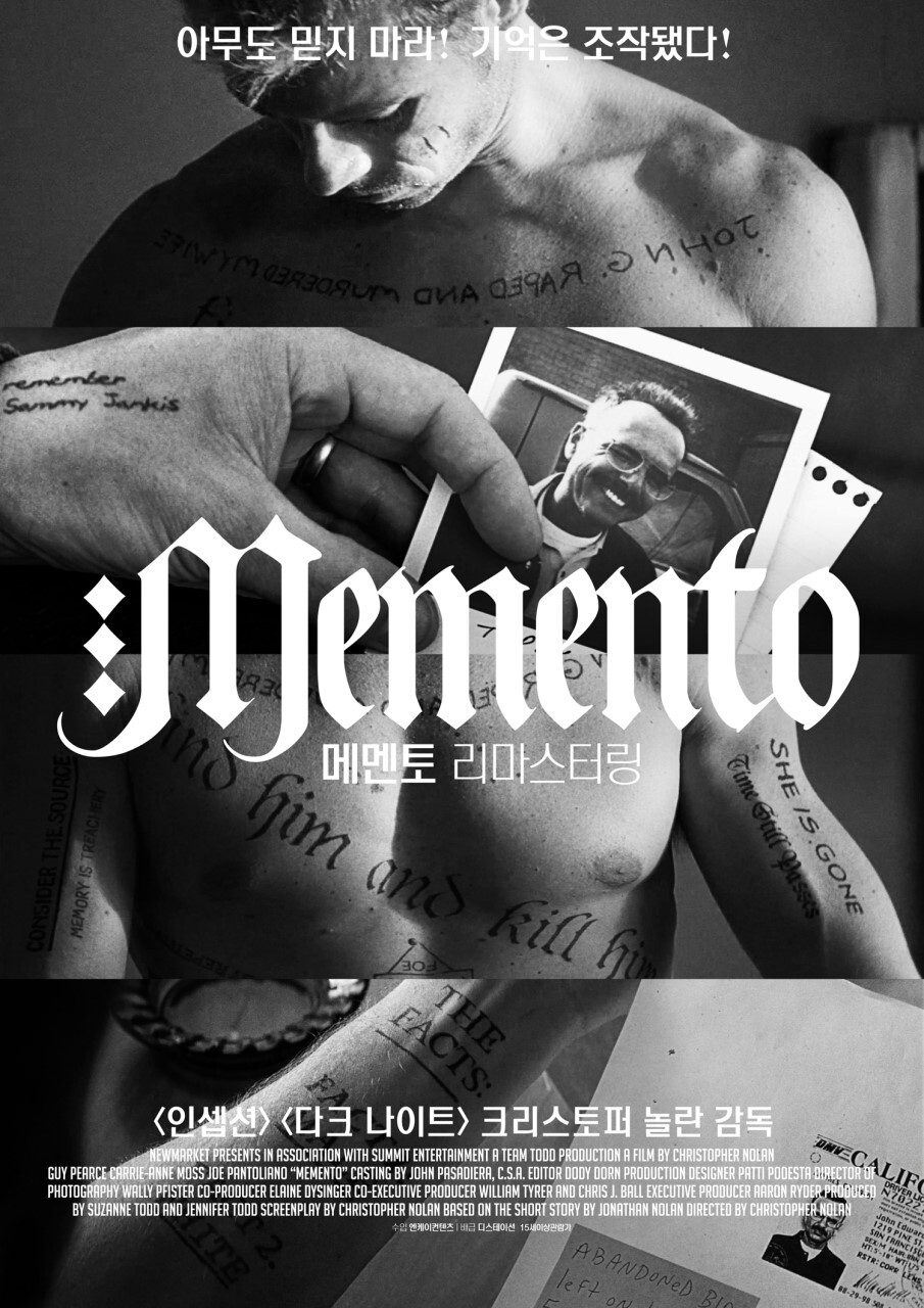메멘토는 아내가 살해당한 후, 10분 밖에 기억 못 하는 단기기억상실증에 걸린 남자가 사진, 메모, 문신으로 남긴 기록을 따라 범인을 쫓는 기억 추적 스릴러이다.