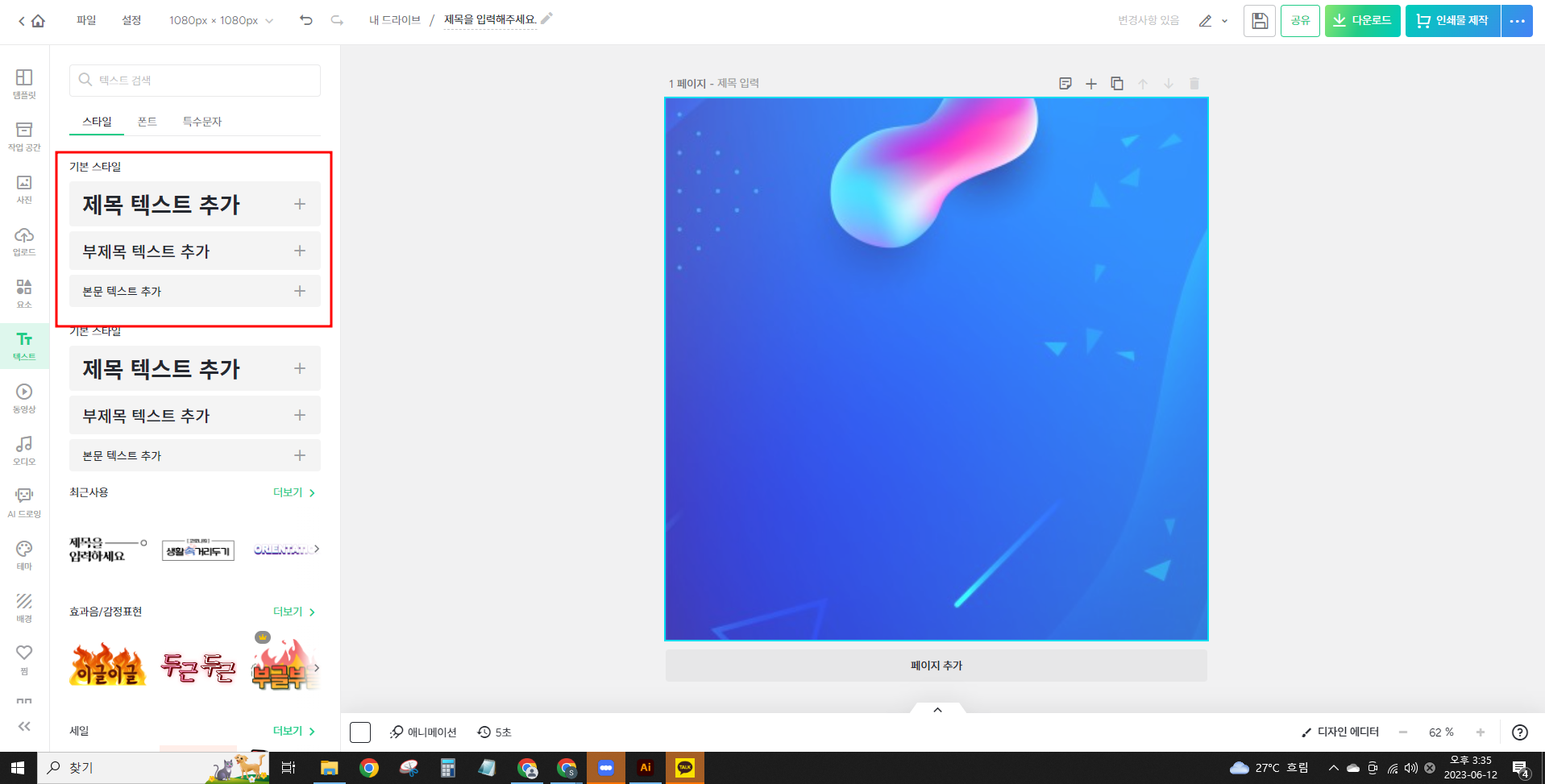 저는 좌측 하단에 있는 배경을 클릭하여 원하는 배경을 선택했습니다. 기존 템플릿이 원하는 주제와 딱 맞는 게 있다면 이미 만들어져 있는 템플릿에서 글자만 바꿔주셔도 됩니다. 저는 텍스트에 강조하는 것을 좋아하므로 배경에서 썸네일을 제작할게요.