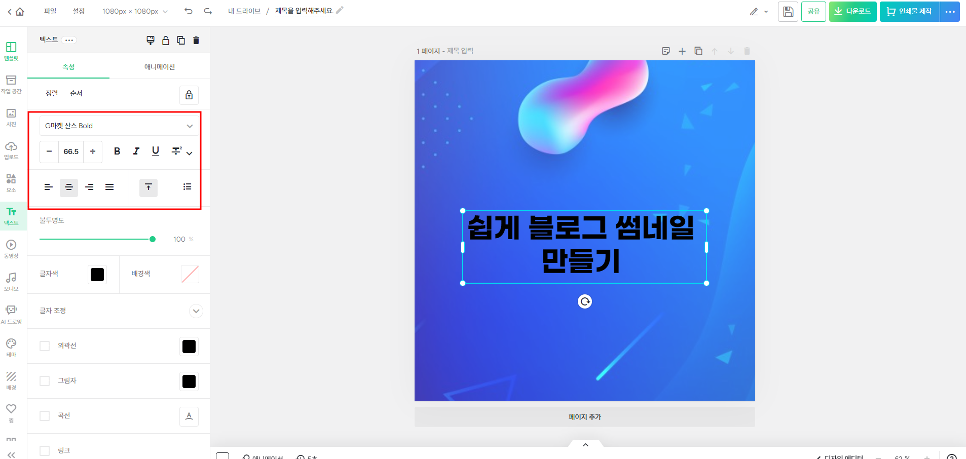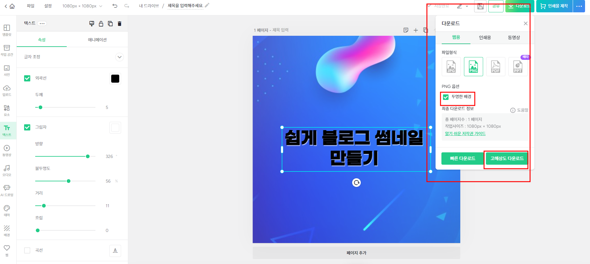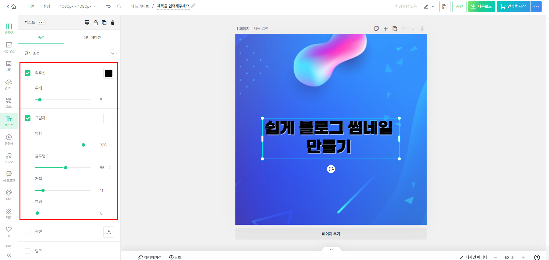 폰트로도 예쁜 썸네일이 간편하고 쉽게 완성되지만 좀 더 가독성을 높이기 위해 외곽선과 그림자 효과를 넣어주세요.