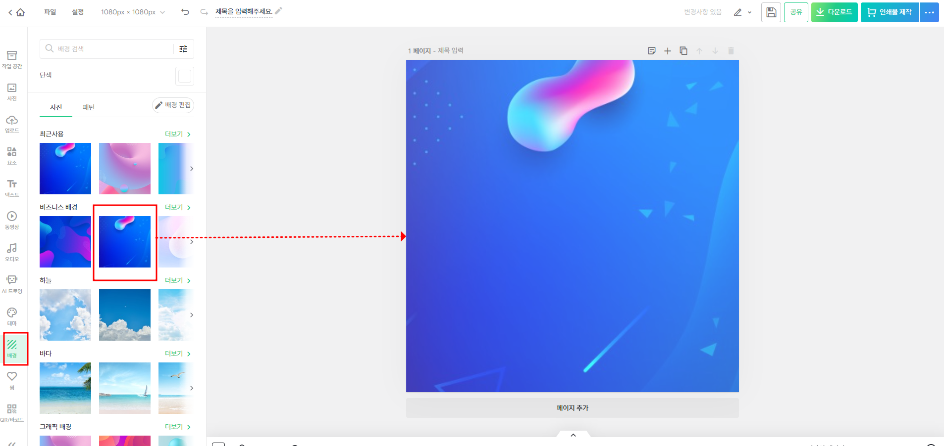 저는 좌측 하단에 있는 배경을 클릭하여 원하는 배경을 선택했습니다. 기존 템플릿이 원하는 주제와 딱 맞는 게 있다면 이미 만들어져 있는 템플릿에서 글자만 바꿔주셔도 됩니다. 저는 텍스트에 강조하는 것을 좋아하므로 배경에서 썸네일을 제작할게요.