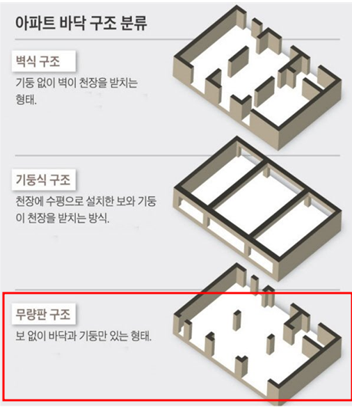 무량판 구조는 천장을 지지하는 벽이나 보 없이 기둥 위에 지붕을 바로 얹는 방식으로 건설 비용과 시간이 적게 들고 공간을 많이 확보할 수 있다는 장점이 있다.